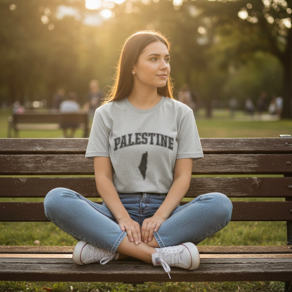 Crafted with top quality ultra soft cotton, this shirt is the perfect blend of comfort and expression. The printed Palestine Varsity design offers a simplistic yet bold illustration of solidarity to Palestine.