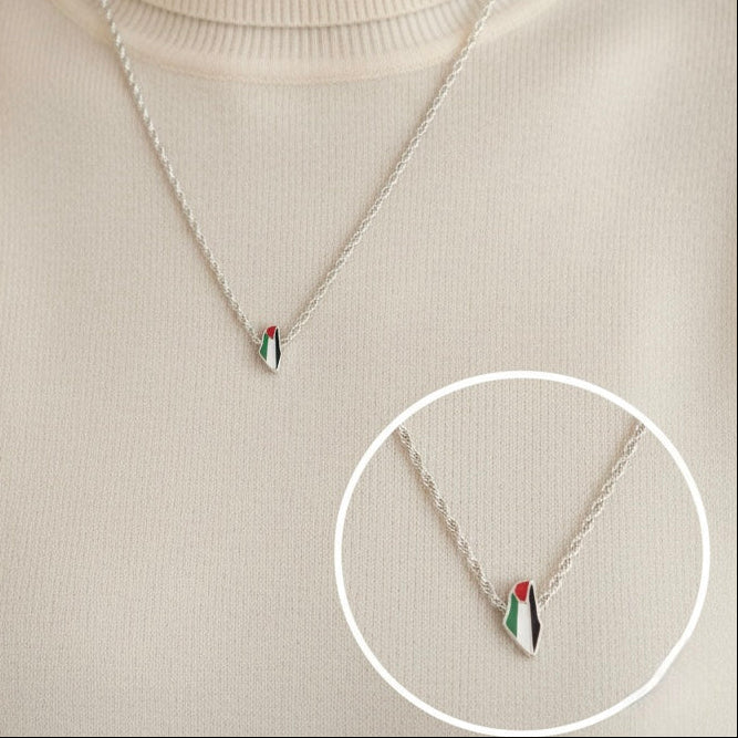 Sterling Silver Palestine Map Flag Charm. Crafted with precision and attention to detail, this charm proudly represents the Palestinian Map, Flag and solidarity to Palestine.